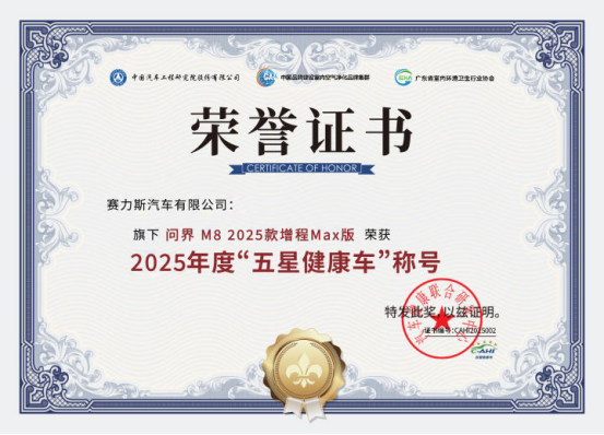 值得关注的是,问界M8荣膺“五星健康车”认证,标志着问界全系构建起“全系五星健康车”产品矩阵。这一成就的背后,源于问界始终从用户真实需求出发,系统化打造“清新呼吸、母婴亲肤、舒适护眼、静谧悦耳、抗扰无忧”的全维健康生态,将健康理念深植产品细节,不仅重塑了车内健康安全标准,更引领了行业发展的新方向。展望未来,问界将继续以健康安全科技为引擎,推动行业迈向更安全、更健康的高品质出行时代。